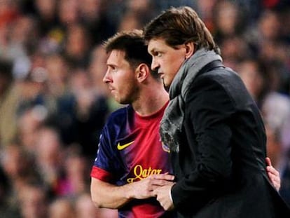 El exdefensa azulgrana, que superó un cáncer, visita a sus antiguos compañeros tras la muerte del técnico