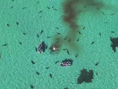 Un dron capta cómo los escualos se comen los restos del cetáceo, que había muerto por causas naturales