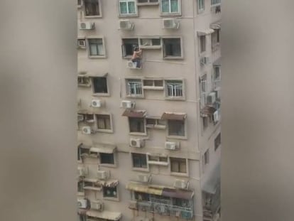 Dos hombres en Macao, China, intentan arreglar su aire acondicionado a una veintena de pisos de altura