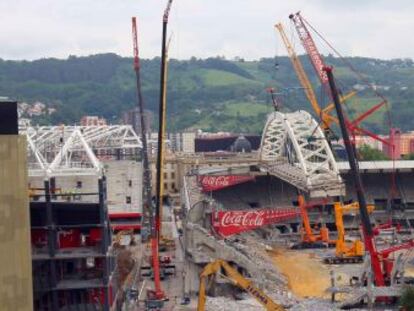 Los trabajos para desmontar la estructura continúan en el semiderruido estadio de Bilbao