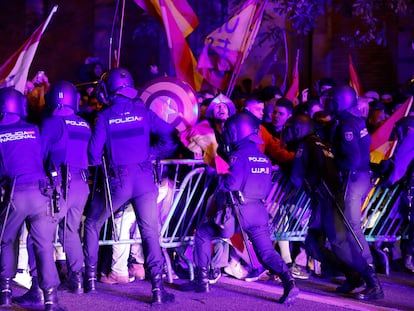 La Policía Nacional carga contra los manifestantes para despejar la calle de Ferraz, sede central socialista, donde han sido detenidas tres personas