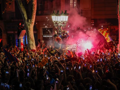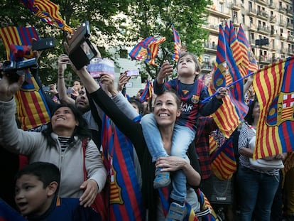 Los seguidores azulgrana se echan a la calle en las Ramblas para festejar un nuevo título tras conquistar la Copa del Rey hace menos de un mes ante el Real Madrid