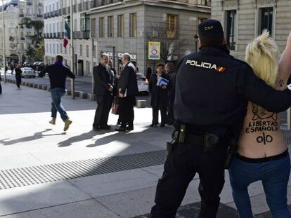 La mujer, de la organización Femen, ha rechazado la aprobación de la reforma de la ley del aborto, que obligará a las menores a tener permiso paterno para interrumpir un embarazo