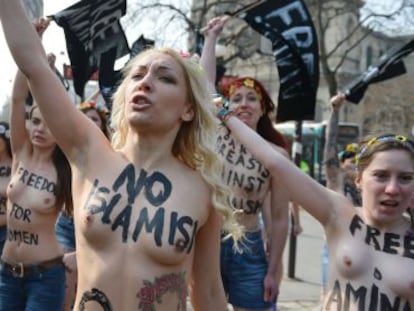 Varias mujeres se han manifestado semidesnudas en París, Berlín, Milán, Bruselas y Kiev Las activistas apoyan a la tunecina Amina, que tuvo que 'desparecer' por una foto en topless
