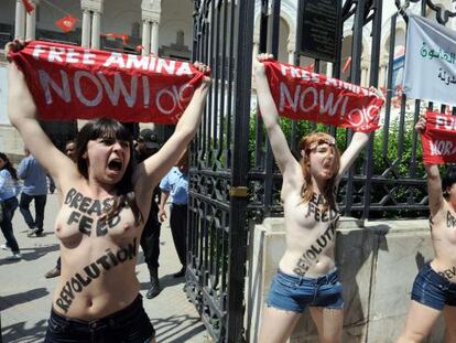 Tres militantes exhiben sus senos ante el palacio de justicia para pedir que sea liberada la tunecina Amina