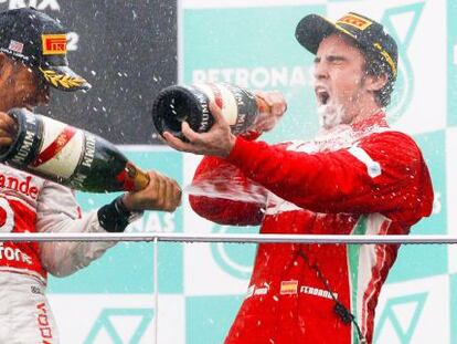 El piloto asturiano se mueve como un pez bajo el agua y supera al mexicano Sergio Pérez y a Hamilton en una caótica carrera en Malasia
