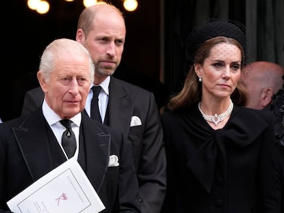 Carlos III, los príncipes de Gales y Andrés de Inglaterra acompañan al duque de Kent en el entierro en la catedral de Westminster. La reina Camila ha sido baja de última hora; se recupera de una sinusitis aguda antes de la visita de Donald Trump al Reino Unido