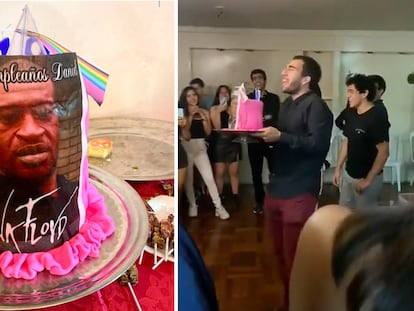 Los asistentes, unos estudiantes universitarios, soplaron las velas de una tarta que llevaba la foto de Floyd, víctima de un crimen racista, repitiendo sus últimas palabras: “I can’t breathe” (No puedo respirar)