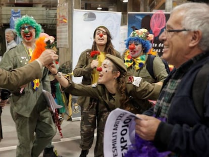 Un ‘ejército’ de payasos protesta en Expojove contra la presencia de las fuerzas armadas