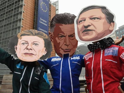 Sindicatos y antiguos funcionarios muestran su indignación a las puertas de las instituciones europeas por la marcha del expresidente de la Comisión a Goldman Sachs