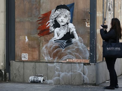 El creador pinta un grafiti frente a la embajada francesa en Londres para denunciar una violenta irrupción policial en la Jungla de Calais