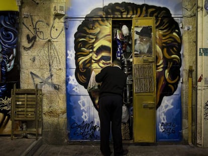 Un artista pinta con espráis retratos históricos en los puestos del Mehane Yehuda