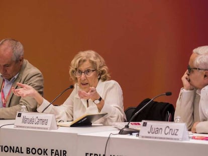 La alcaldesa, Manuela Carmena y el director de EL PAÍS, Antonio Caño, conversan en torno a la capital española en la FIL