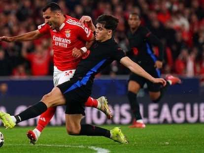 El Barça se clasifica para los cuartos de final de la Champions después de una primera parte pletórica, coronada por los goles del extremo catalán y de Raphinha, ante un valiente Benfica