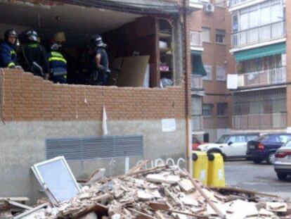 Parte del tabique exterior de la vivienda situada en la calle del Discóbolo cae a la calle Daña a dos coches estacionados en las proximidades