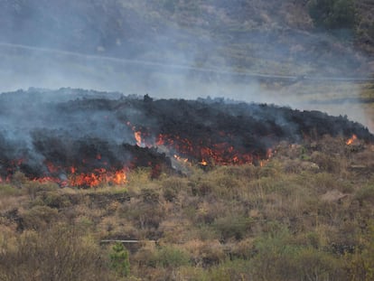 La colada mide ya 3,8 kilómetros y alcanza hasta 12 metros de altura, pero no llegará a la costa ni este jueves ni el viernes. El magma ha destruido unas 400 casas y cubre unas 220 hectáreas