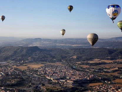 Más de 60 globos aerostáticos de múltiples formas y figuras sobrevuelan la comarca barcelonesa del Anoia en la inauguración de la concentración más grande de aerostáticos de España