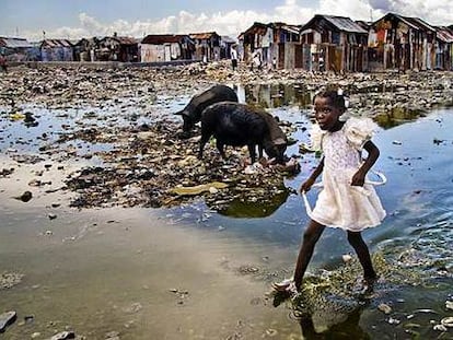 La imagen muestra una niña caminando descalza entre charcos de barro y mugre en un barrio de chabolas de Puerto Príncipe