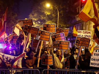 Sánchez continúa diseñando su nuevo Ejecutivo mientras se mantienen las protestas diarias en Ferraz | Unas 400 personas se han reunido por decimoséptimo día consecutivo frente la sede socialista en Madrid para protestar contra la amnistía y la investidura de Sánchez
