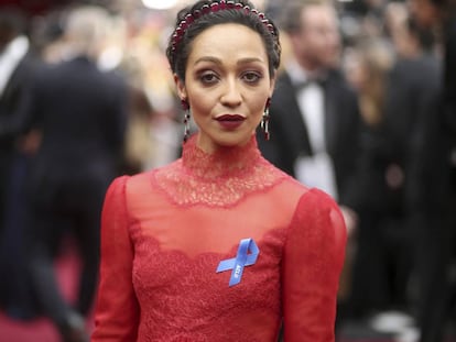 La actriz Ruth Negga y la modelo Karlie Kloss, cuñada de un asesor de Trump, desfilan por la alfombra roja con el símbolo