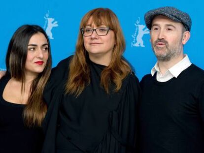 La directora Isabel Coixet posa con los actores Javier Cámara y Candela Peña, protagonistas de su nueva película Ayer no termina nunca