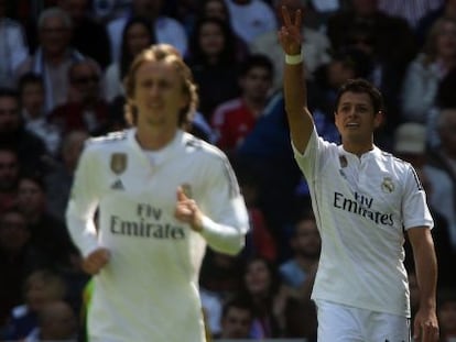 El punta mexicano, que nunca había jugado tan poco (590 minutos), sobrevive en el Madrid y se desahoga con la selección
