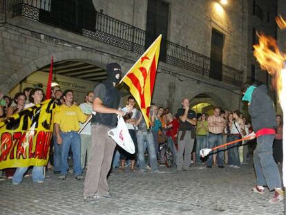 Amb el lema 'Jo també cremo la corona espanyola', un centenar de persones van fer un brindis davant de l'Ajuntament