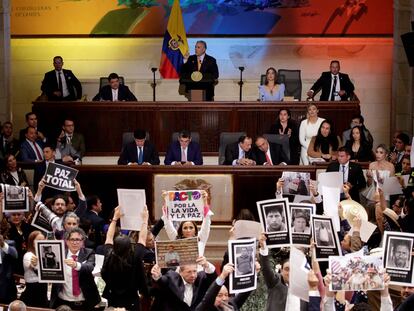 El presidente de Colombia dio su último discurso ante el parlamento lanzando varios dardos a sus opositores, y provocó gritos de protesta entre los congresistas