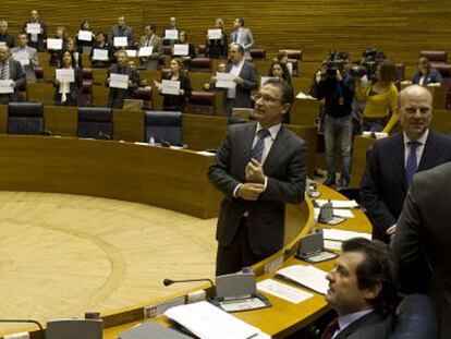 El PSPV lleva el ‘caso Triskel’ al juzgado y anuncia más denuncias por corrupción Los diputados del PSPV exhiben en sus escaños carteles con el lema #RTVVnoestanca