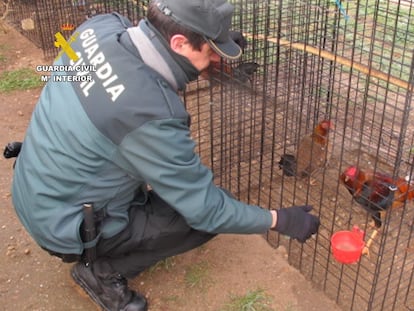 Los agentes hallan 136 ejemplares, 12 con las crestas cortadas y espolones afilados, presuntamente, para participar en peleas de gallos