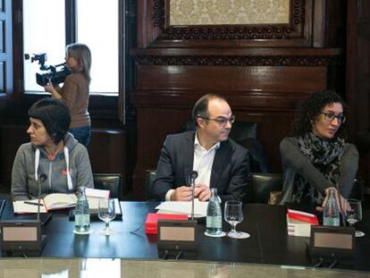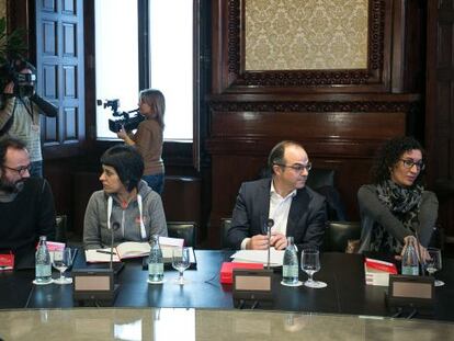 A Junqueras, vicepresidente, le acompañan Romeva, Comín, Mundó, Serret y Bassa