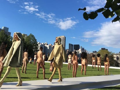 El calor y la larga espera provocan el malestar de las maniquíes, en la isla de Roosevelt, el lugar elegido por el rapero para presentar su colección