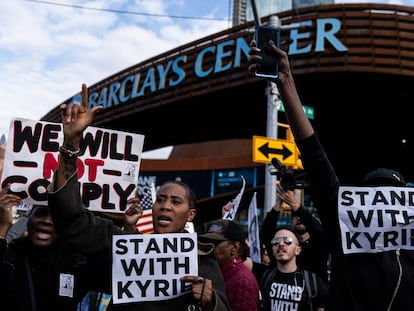 Un grupo de personas protesta ante el pabellón de los Nets y muestran su solidaridad con el base que no puede jugar por negarse a ser vacunado