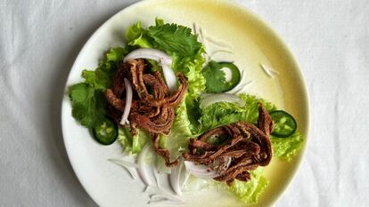 Una oreja de cerdo crujiente por fuera y melosa por dentro acompañada de una sencilla salsa de yogur es el plato perfecto para un picoteo (o una comida completa si te tomas unos cuantos)
