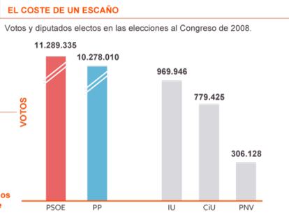 IU, con dos representantes en el Congreso, necesita casi medio millón de votos por escaño PSOE y PP requieren menos de 67.000 por los 78.000 de CiU y 51.000 de PNV