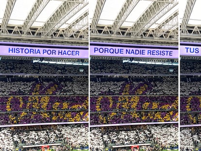 El intérprete canta “por qué”, pero en ese momento la letra proyectada en los marcadores del Bernabéu dice “porque”
