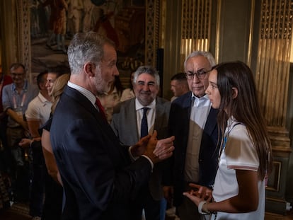La ‘skater’ española, de 15 años, charla un rato con Felipe y Letizia en la recepción al equipo olímpico español en la embajada en París