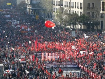 170.000 manifestantes en Madrid y 275.000 en Barcelona, según cálculos de EL PAÍS UGT y CC OO piden una negociación y el Gobierno dice que "la senda reformista es imparable" Industria y Transportes, los sectores más afectados por los paros 176 detenidos en incidentes aislados y 116 heridos, según el Ministerio del Interior
