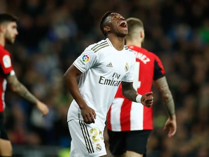 Los blancos se estrellan con los postes del Athletic y pierden paso con el Barça por su poco gol