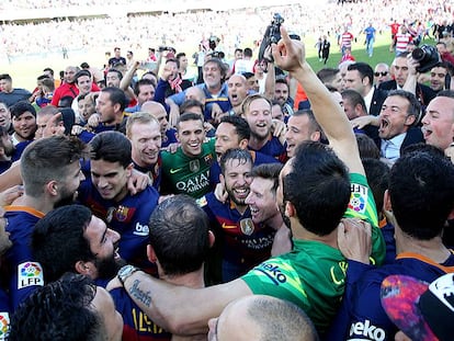La afición del Granada celebra la permanencia lograda en la jornada anterior al tiempo que la del Barça se felicita por la conquista de una nueva Liga