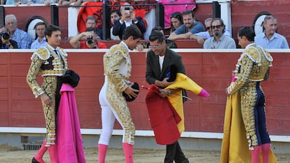 El padre del torero, vestido de calle, bajó al ruedo y presidió el intercambio de trastos en sustitución de Paco Ureña, padrino de la ceremonia