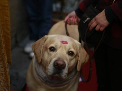 El párroco de la iglesia de San Antón bendice este martes a las mascotas de los que acudan al templo