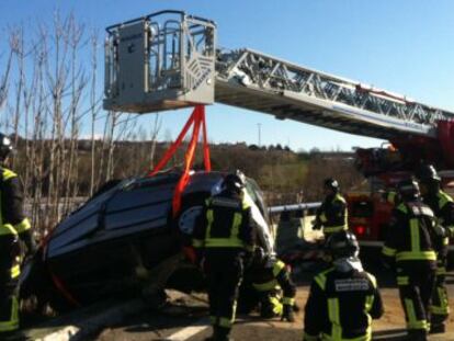 El conductor pierde el control del vehículo y choca contra un muro de hormigón El coche queda prácticamente partido y a punto de caer al Guadarrama
