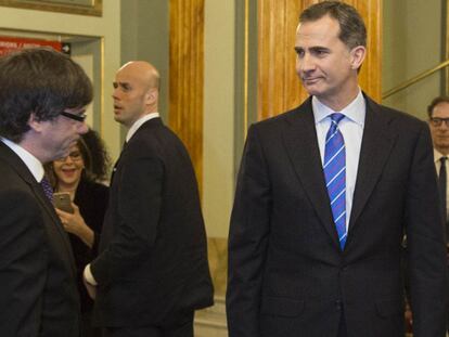 Felip VI i el president de la Generalitat es troben en la inauguració del Mobile al Liceu