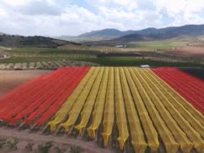 La insignia de 22.000 metros cuadrados de malla rojigualda protege unos cultivos de cereza en la comarca de Calatayud, Zaragoza