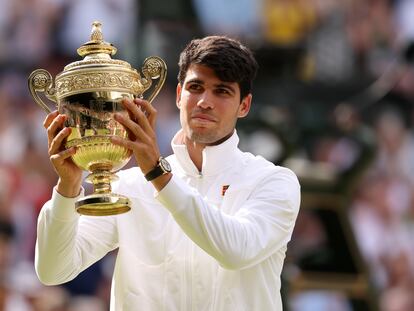 Alcaraz barre a Djokovic y gana su segundo Wimbledon consecutivo (6-2, 6-2, 7-6(4), 2h 26m) | El de El Palmar triunfa en la hierba tras conquistar la arcilla de Roland Garros este mismo año e impide a Nole empatar a ocho títulos con Federer en Londres | Nole: “Carlos ha merecido ganar hoy, ha hecho un tenis increíble”