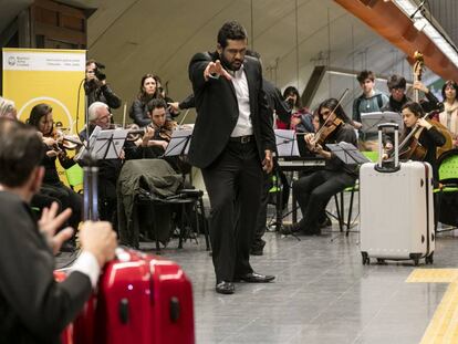 La compañía argentina Ópera Periférica interpreta 'La Serva Padrona' frente a decenas de viajeros