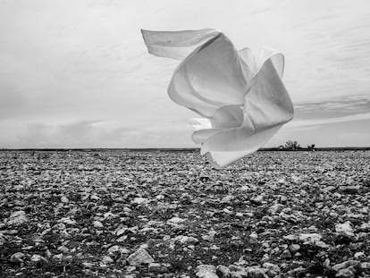 El páramo, antiguo fondo marino hoy convertido en una llanura seca y deshabitada, inspira el fotoensayo ‘El fondo marino’, que, guiado por las palabras de Miguel Delibes y la práctica del caminar como forma de pensar el territorio, explora la vida de quienes aún resisten en esta tierra cada vez más vacía, marcada por sequías, heladas tardías y una crisis climática que expulsa a su gente; en su aspereza persiste la memoria del mar ausente, un paisaje emocional de pérdidas y permanencias donde la autora se reconoce y respira el viento como si, al atravesarla, el mar regresara. En palabras de Delibes: “Un mar gris y violáceo en invierno, un mar verde en primavera, un mar amarillo en verano y un mar ocre en otoño, pero siempre un mar”