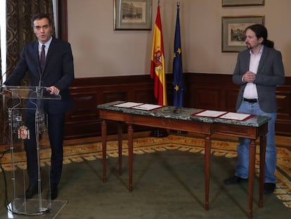 Los líderes de PSOE y Unidas Podemos firmaron este martes un acuerdo de Gobierno tras las elecciones