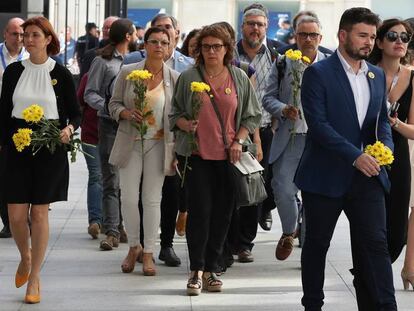 Los 14 representantes del partido independentista han llegado al hemiciclo con ramos en alusión a los nueve políticos catalanes en prisión